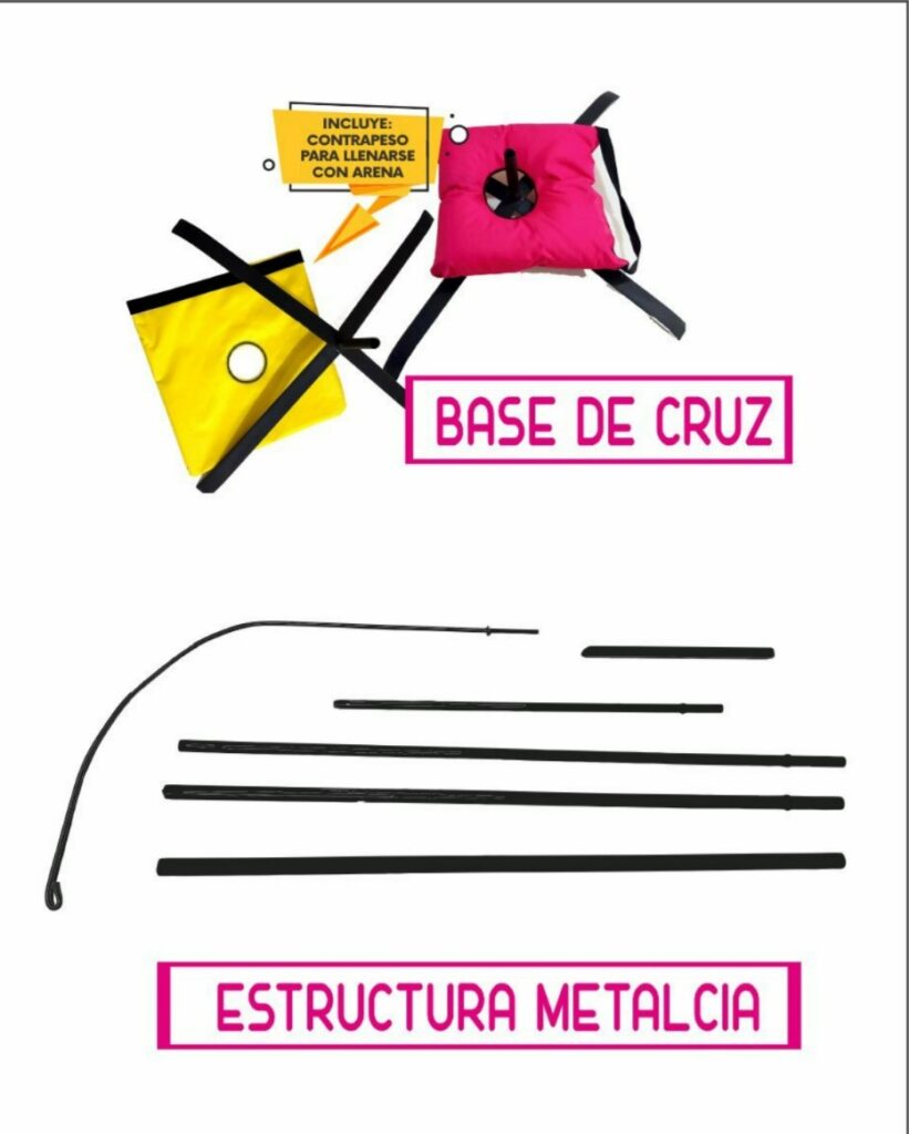 La bandera cuenta con una estructura dividida en 5 partes de fácil armado. Cada una de estas estructuras se colocan dentro de la bandera y finalmente se coloca una base metálica en forma de cruz y sobre la misma unos contrapesos o si el cliente lo desea se puede hacer una perforación en el concreto para colocar una estaca de metal, sobre la misma se inserta la bandera, dejando su emblemática presentación.